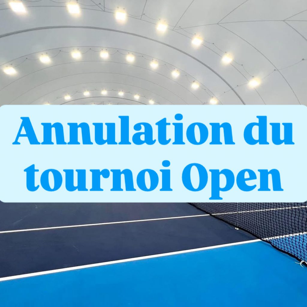 Aujourd’hui devait débuter notre tournoi Open. Malheureusement, suite aux intempéries de ces derniers jours, la bulle a été nettement endommagée. Par mesure de sécurité, la municipalité a décidé de fermer la structure et nous sommes contraint d’annuler l’ensemble du tournoi initialement prévu du 27 juin au 13 juillet. Au nom du président, de l’ensemble du bureau et du juge arbitre, nous vous présentons toutes nos excuses et nous espérons vous retrouver l’année prochaine sur nos terrains