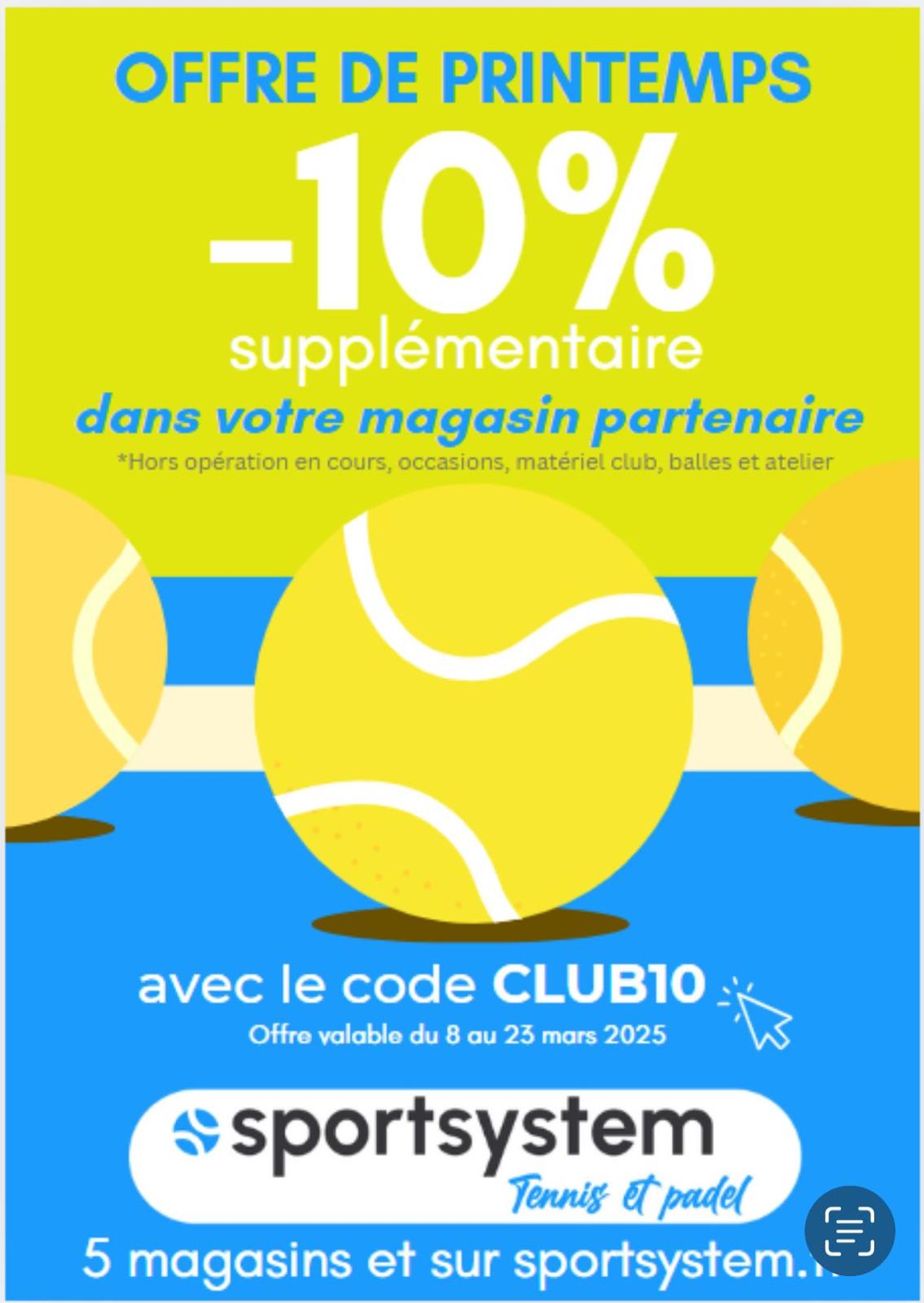 Avec l’arrivée du printemps notre magasin partenaire SPORTSYSTEM est heureux d’offrir une remise exceptionnelle de 10 % supplémentaires à tous les adhérents du club.