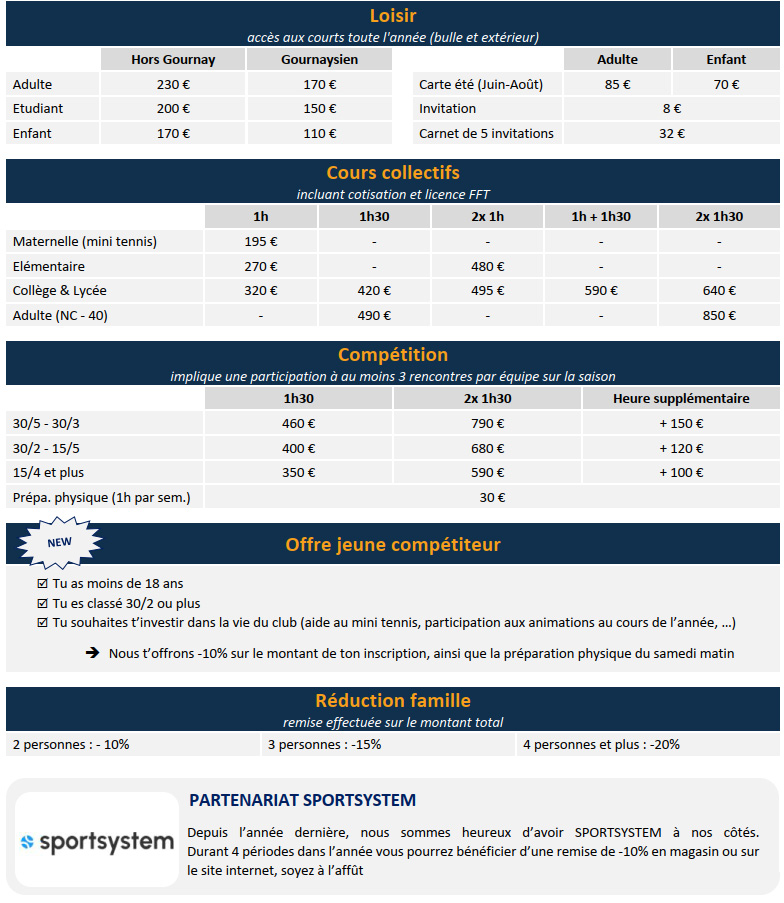 Tarifs 2025/2026